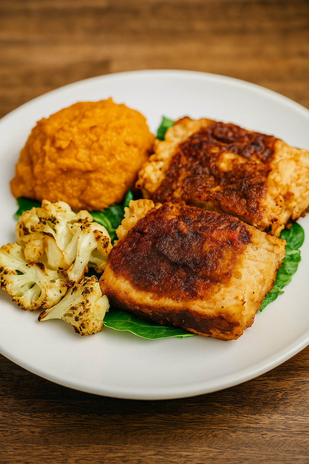 CREOLE MEATLOAF RECIPE WITH SWEET POTATO MASHED AND ROASTED CAULIFLOWER